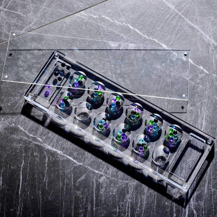 This Modern Lucite Mancala makes playful addition to your living room & family room. Family fun in style! Features clear acrylic board and 48 glass pieces in multiple colors. Includes magnetic lucite cover! The perfect blend of the classic game and modern décor.